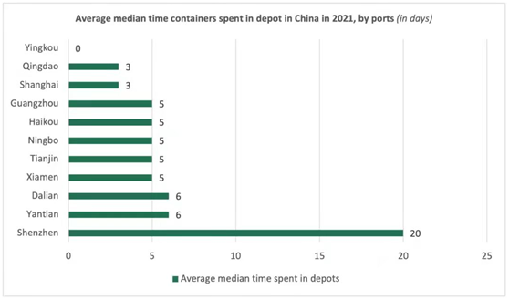 Container xChange和Fraunhofer CML的一項(xiàng)研究發(fā)現(xiàn),2021年,集裝箱在中國(guó)倉庫停留的平均時(shí)間為5天,而2020年為16天。其他主要出口國(guó),包括越南 新加坡 泰國(guó)和印度尼西亞,集裝箱在倉庫停留平均時(shí)間分別為9天 11天 16天和19天。2021年,集裝箱在倉庫停留時(shí)間最長(zhǎng)的是美國(guó)和英國(guó),其平均停留時(shí)間分別為50和51天。相比之下,集裝箱在德國(guó)的停留時(shí)間為25天。