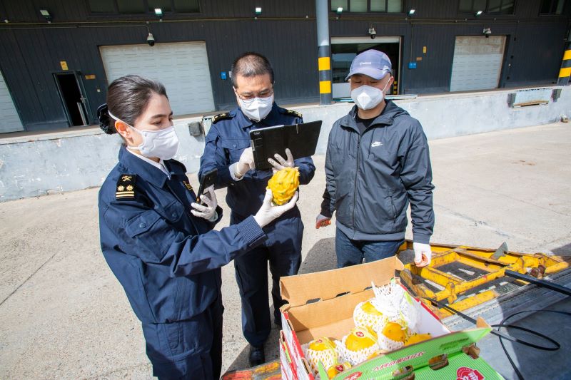為做好這批“麒麟果”的檢疫通關(guān)工作,助力水果搶“鮮”上市,首都機(jī)場海關(guān)提前制定檢疫監(jiān)管方案,積極聯(lián)系對接地面代理企業(yè),及時追蹤航班抵港時間,確保“即到即查”。在海關(guān)監(jiān)管場地,現(xiàn)場關(guān)員快速核對輸華標(biāo)簽、植物檢疫證書等證單,并實行外觀檢查等檢疫措施,未發(fā)現(xiàn)有害生物,這批990公斤的水果被快速放行。