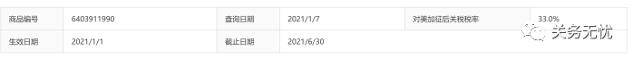 如上案例中,A公司進口貨物為休閑皮鞋,申報商品編號為6403911990,該商品編碼項下的最惠國關稅率為8%,中國于2019年6月1日起對原產(chǎn)于美國該稅目下的商品實施加征25%的關稅。