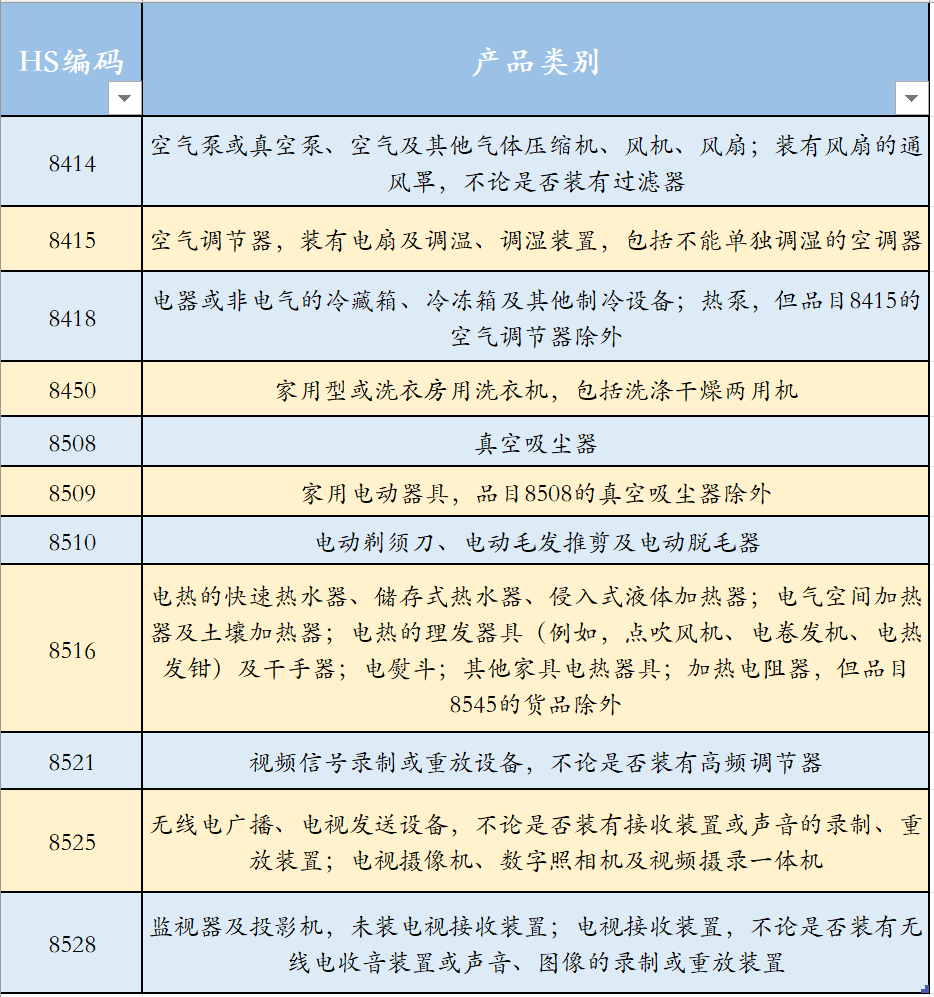 出口美國(guó)的家電產(chǎn)品中,電池充電器、商用電冰箱和冷柜、供暖機(jī)組及其他住宅用產(chǎn)品應(yīng)符合《2005年能源政策法案》(EPAct2005)要求,主要用能電器須符合《能源政策與節(jié)約法案》(EPCA)規(guī)定的最低能效標(biāo)準(zhǔn)(MEPS)要求。冷藏冷凍箱、洗碗機(jī)、熱水器、房間空調(diào)器、洗衣機(jī),火爐(包括鍋爐)、泳池加熱器和吊扇等產(chǎn)品須根據(jù)《美國(guó)國(guó)家能源節(jié)約法案1978》(NECPA)、《器具標(biāo)簽規(guī)則》等法案的要求施加能源指南能效標(biāo)識(shí)(EnergyGuide)。除溫器、洗院機(jī)、冷藏器、家用空氣凈化器、家用熱水器、冷水機(jī)和微波爐等產(chǎn)品須符合能效相關(guān)標(biāo)準(zhǔn)要求。