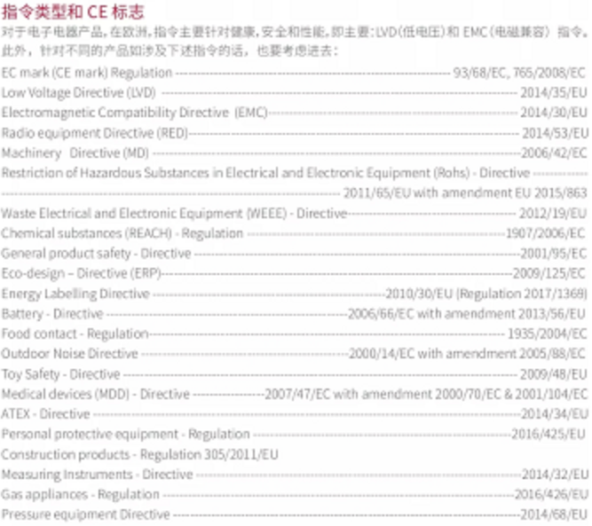 歐盟市場(chǎng)目前共有27個(gè)成員國(guó),24種語(yǔ)言,其家用電器基本使用230V 50Hz的電源,家電產(chǎn)品進(jìn)入歐盟必須符合相關(guān)指令(Directive)。產(chǎn)品上必須有CE標(biāo)志,歐盟主要包括以下指令: