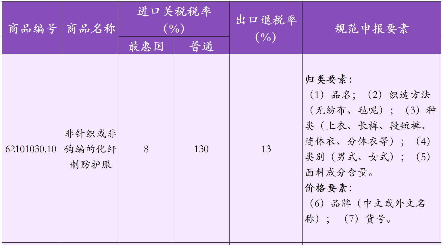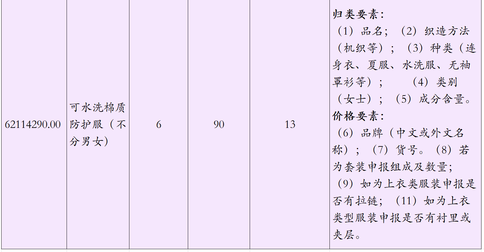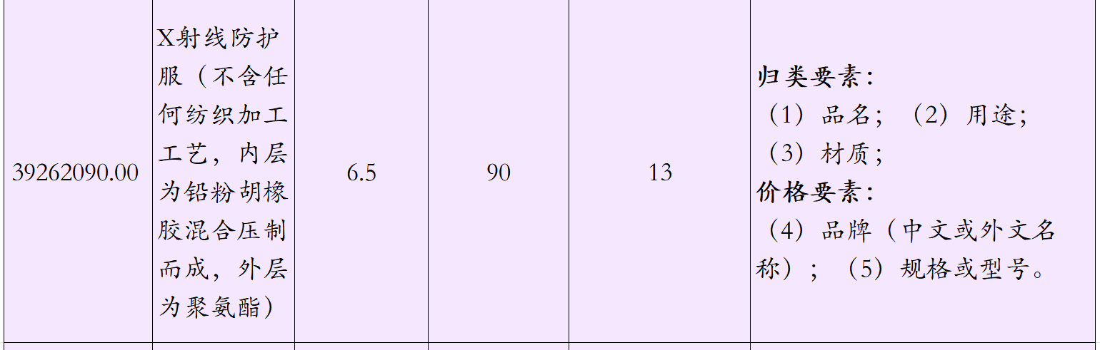 還有一些特殊的防護(hù)服,如醫(yī)院里放射性檢查工作人員穿著的X射線防護(hù)服,該防護(hù)服不含任何紡織加工工藝,分為內(nèi)層和包裹層兩部分組成,內(nèi)層為鉛粉和橡膠混合壓制成片,制成身體所需防護(hù)部位的樣式,內(nèi)層被聚氨酷片包裹,聚氨酷片構(gòu)成該商品塑料的基本特征這類防護(hù)服可以保護(hù)人體的骨髓及造血系統(tǒng)、生殖器官、甲狀腺和內(nèi)臟等重要器官,減少X射線對(duì)人體的損害。常見(jiàn)的防護(hù)服可能涉及的歸類及規(guī)范申報(bào)要素如下: