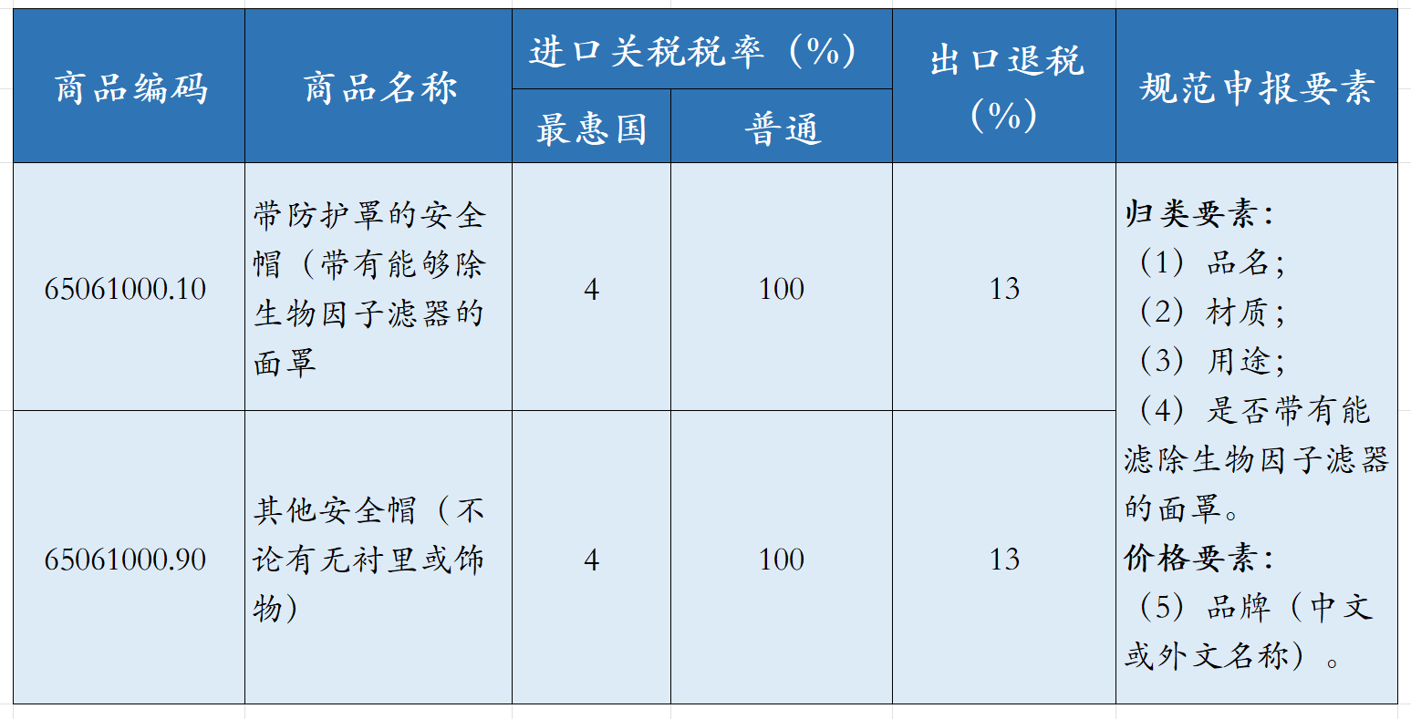 在2022版《中華人民共和國(guó)進(jìn)出口稅則》 (簡(jiǎn)稱《稅則》)列目結(jié)構(gòu)中,安全帽有具體列名歸入6506.1000項(xiàng)下,該商品編碼主要包括體育用帽、軍事或消防員用的頭盔、摩托車駕駛員、礦工或建筑工人用的頭盔,不論其是否裝有防護(hù)墊或(對(duì)于某些頭盔)裝有話筒或耳機(jī)。安全帽可能涉及的歸類及規(guī)范申報(bào)如下: