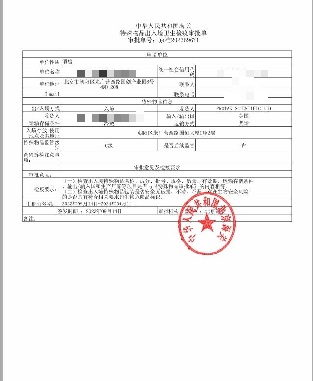 1.客戶提供情況說明,產(chǎn)品分析證書,風險評估報告。在生物試劑進口清關(guān)之前辦理特殊生物試劑許可證,一般在5個工作日內(nèi)能完成《出/入境特殊物品衛(wèi)生檢疫核銷單》的申請。