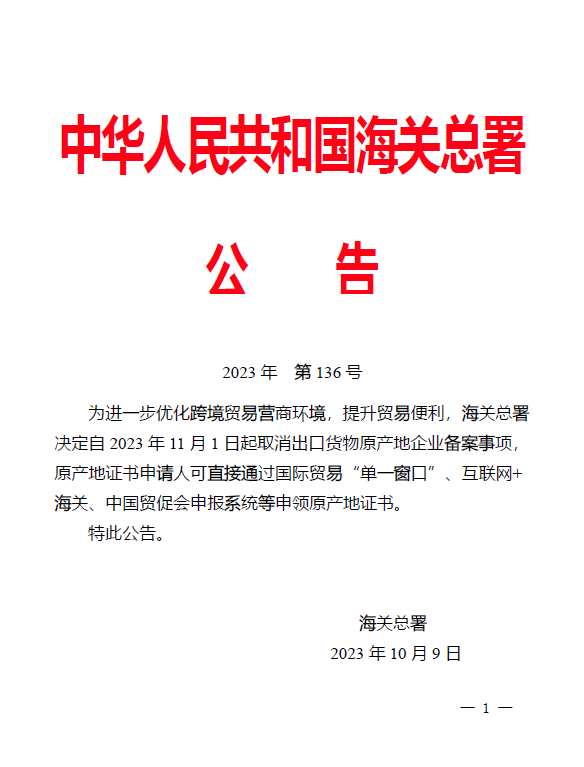 關(guān)于取消出口貨物原產(chǎn)地企業(yè)備案事項的公告