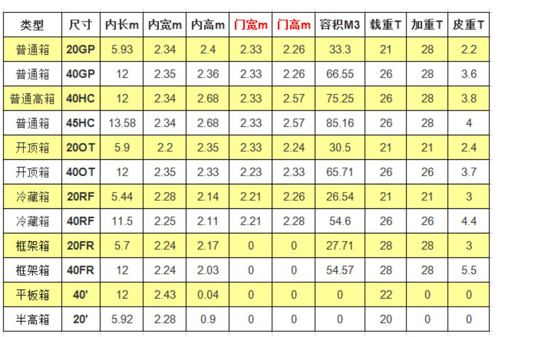 1. 集裝箱上會(huì)標(biāo)示有:箱號(hào),箱重,限重等信息。2. 所有集裝箱的配貨毛重都以船公司最后確認(rèn)為準(zhǔn),不同船公司可能給出的配重都不一樣。比如船公司A給出20’FR柜可以裝載到28噸,船公司B給出20’FR柜可以裝載到26噸。3. 一般普柜和開頂柜的貨物寬度不宜超過2.28米,否則可能裝不上去,寬度超過2.3米的需要使用框架柜。